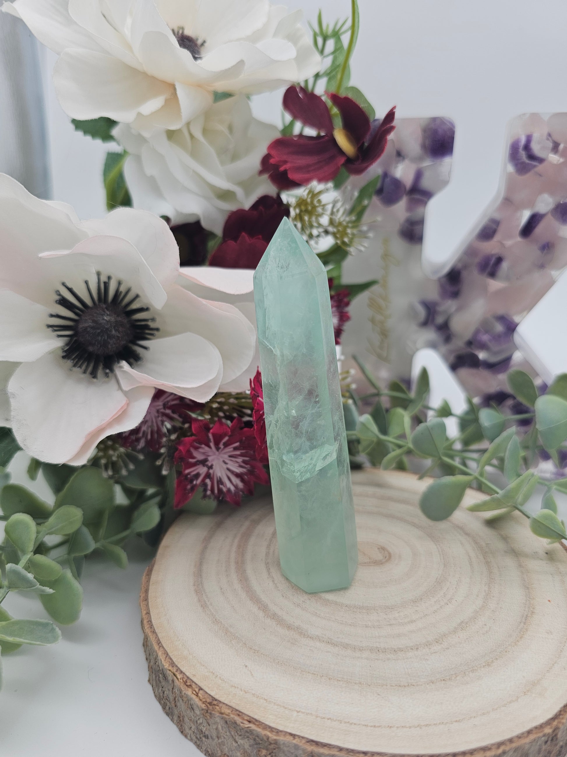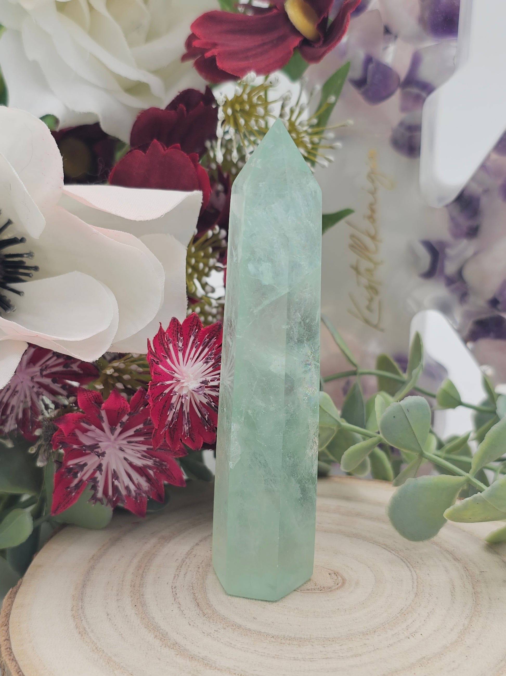 Nintendo grüner Fluorit Turm, leicht schräg, dafür transparent und mit Regenbogen.