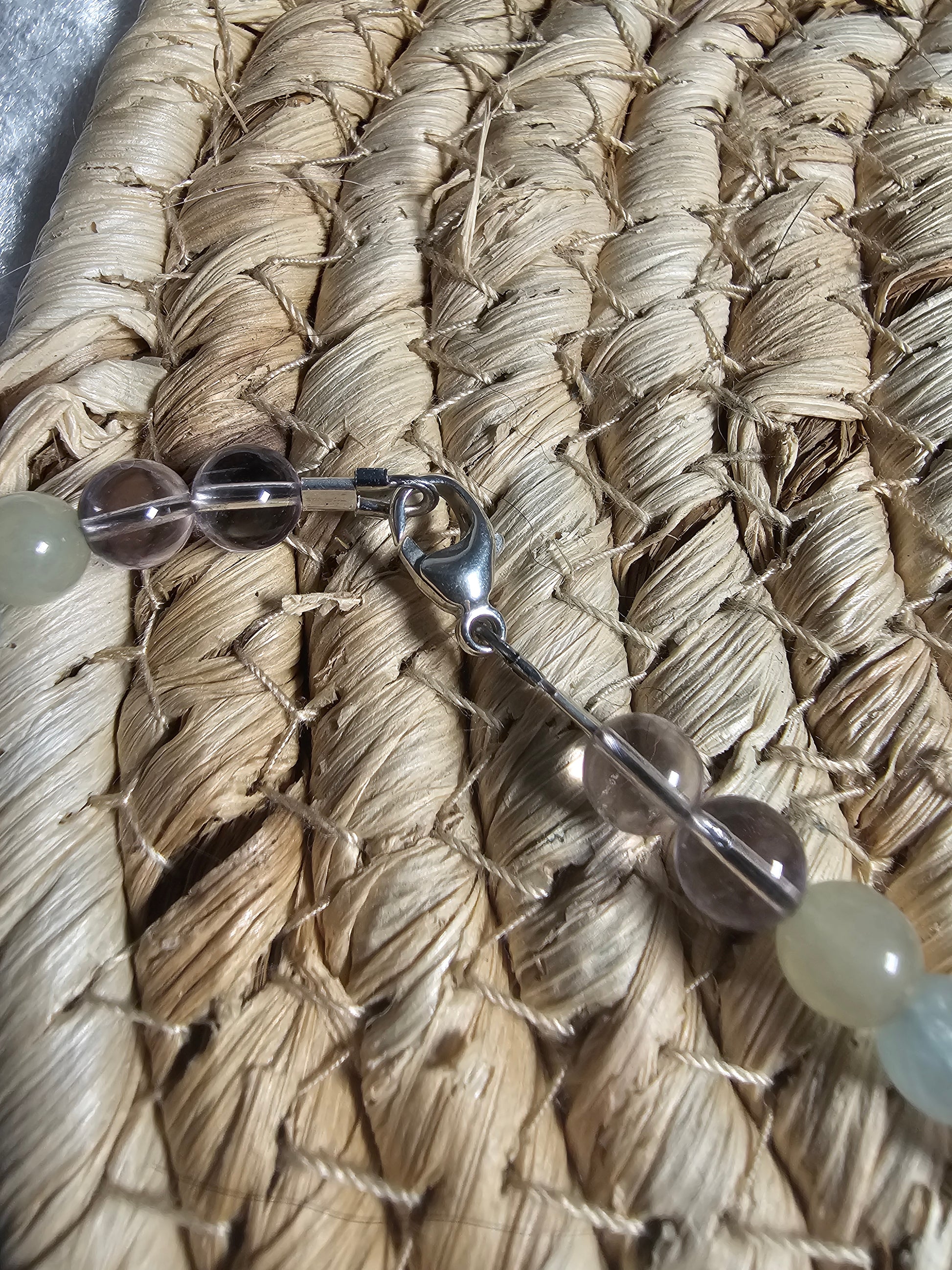 Sie ist handgemacht und besteht aus: Amethyst Flosse, Bergkristall fac. Aura, Süßwasser Perlen, Berlin, Granat, Bergkristall, Aventurin und Apatit.