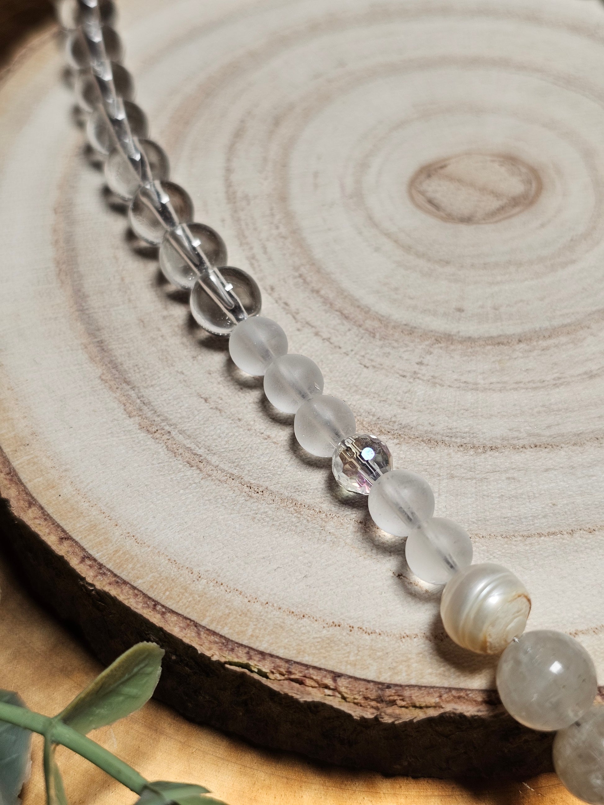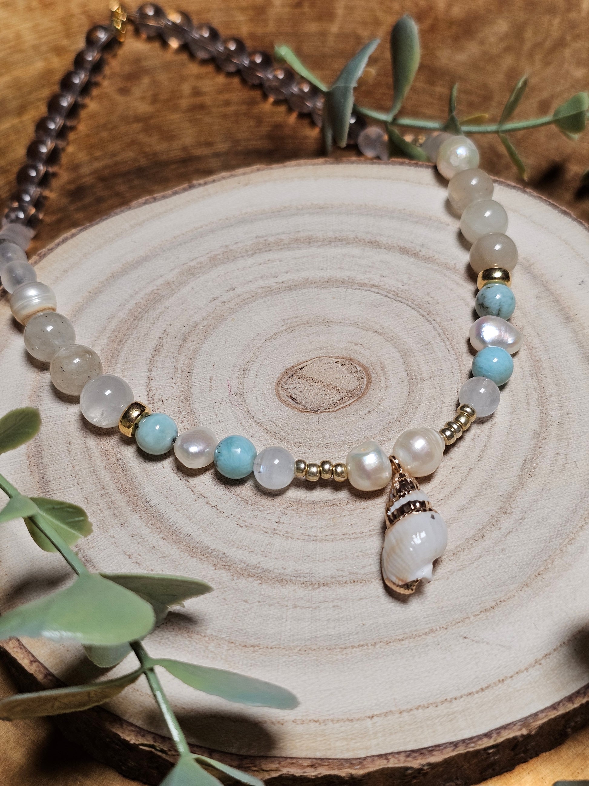 Sie besteht aus Süßwasserperlen, Larimar, Mondstein und Bergkristall. Durch die goldenen Details bekommt das ganze noch einen edlen Look. Sie soll dich im Urlaub begleiten? Dann schnapp sie dir, sie ist ein absolutes Einzelstück.