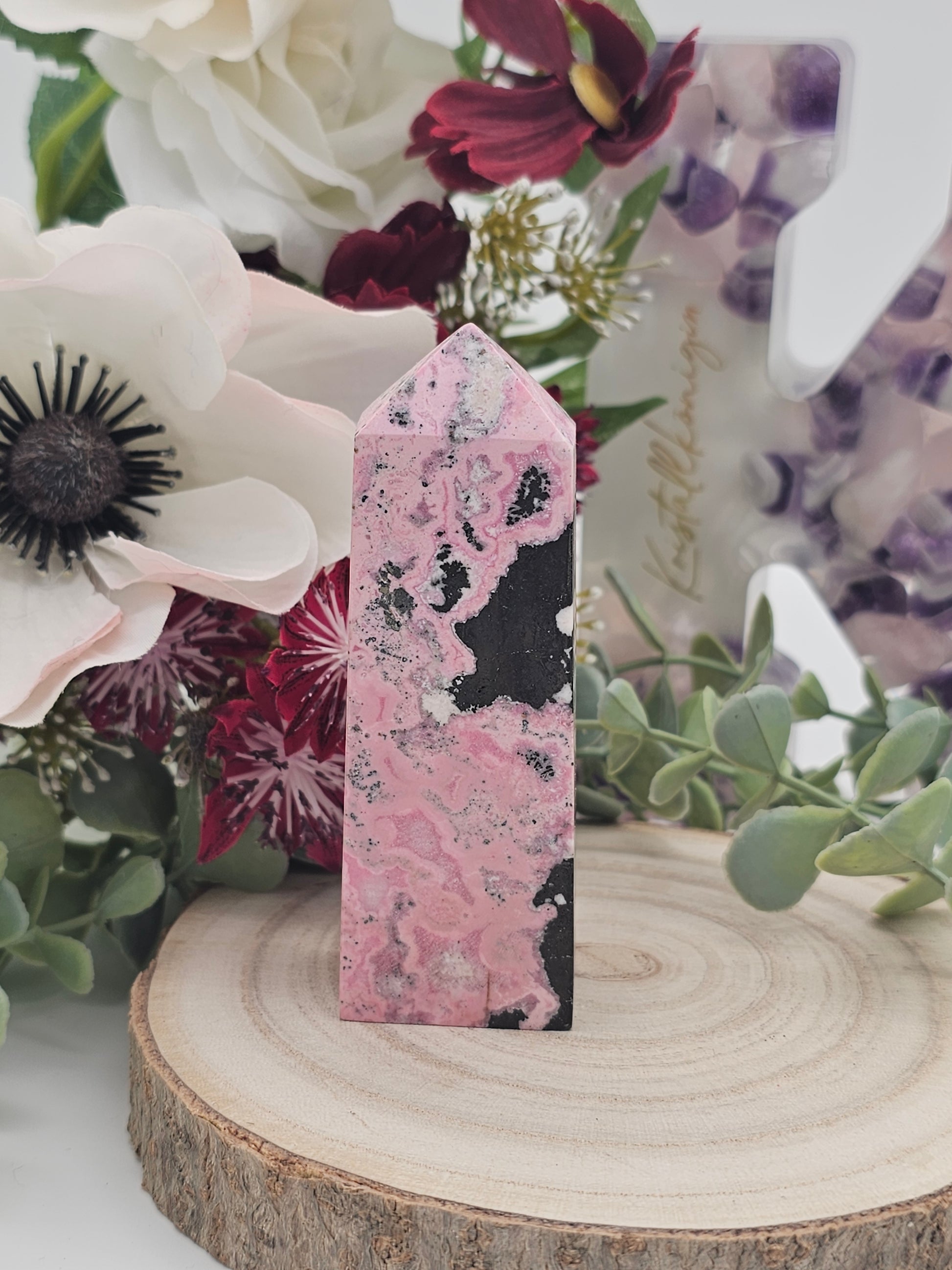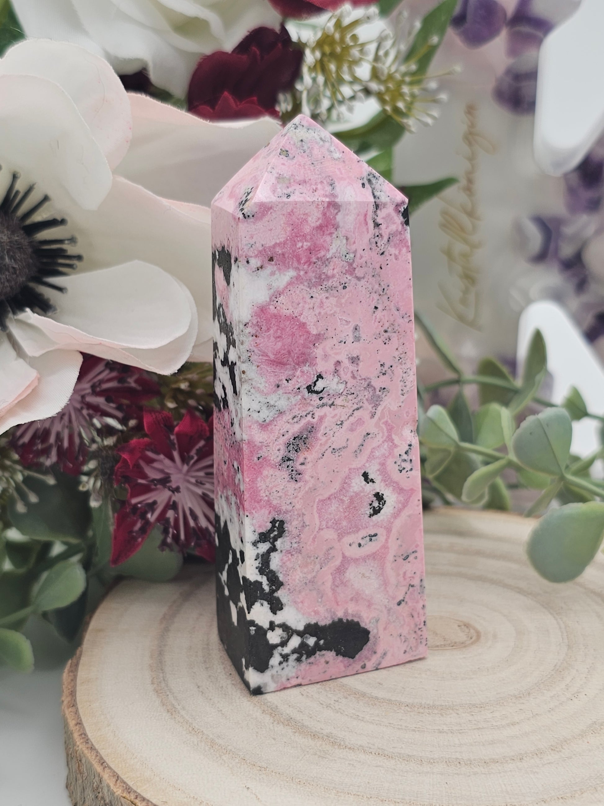 Rhodonit aus Peru in einem saftigen Pink mit schwarzen und weißen Muster.