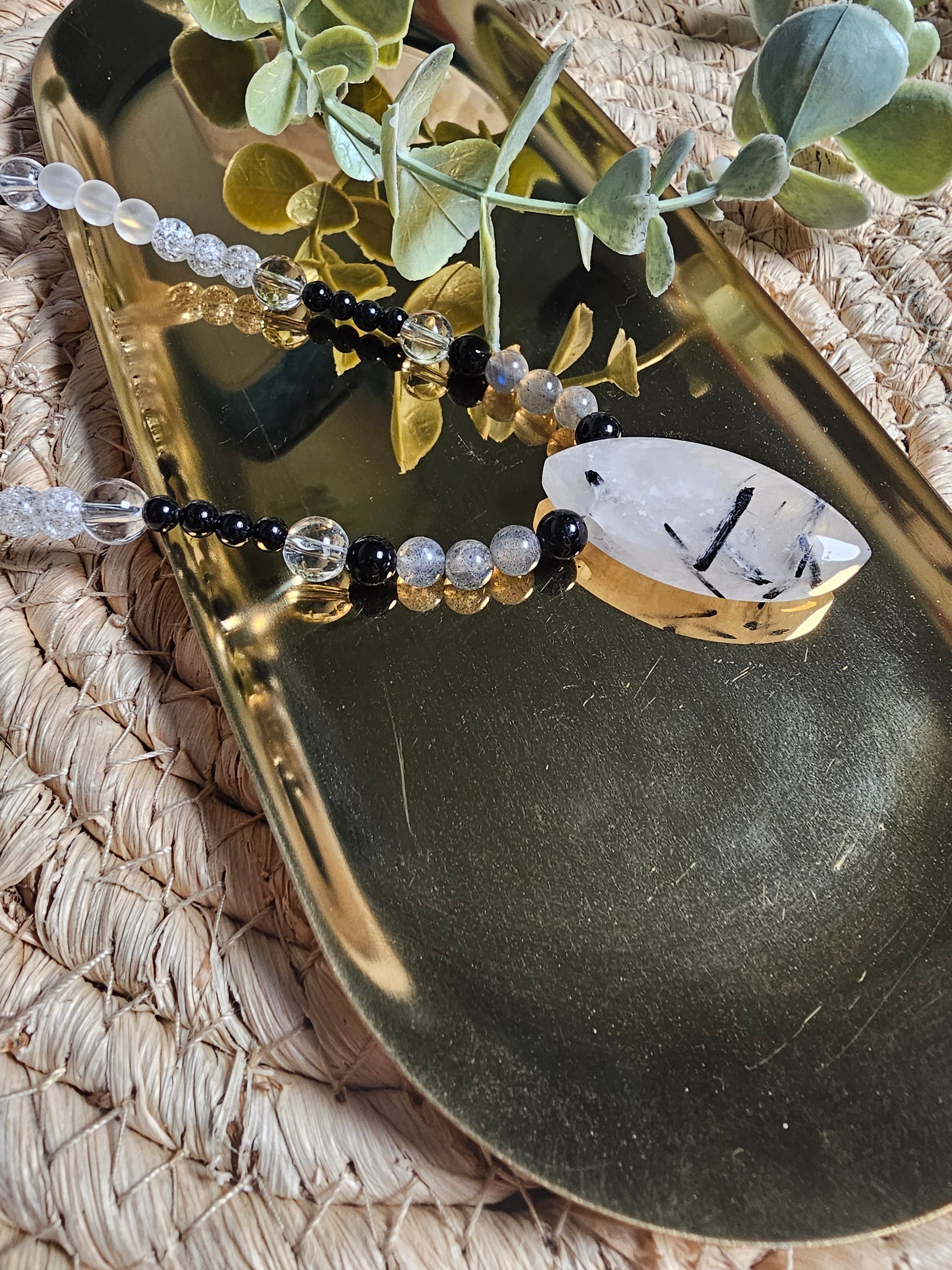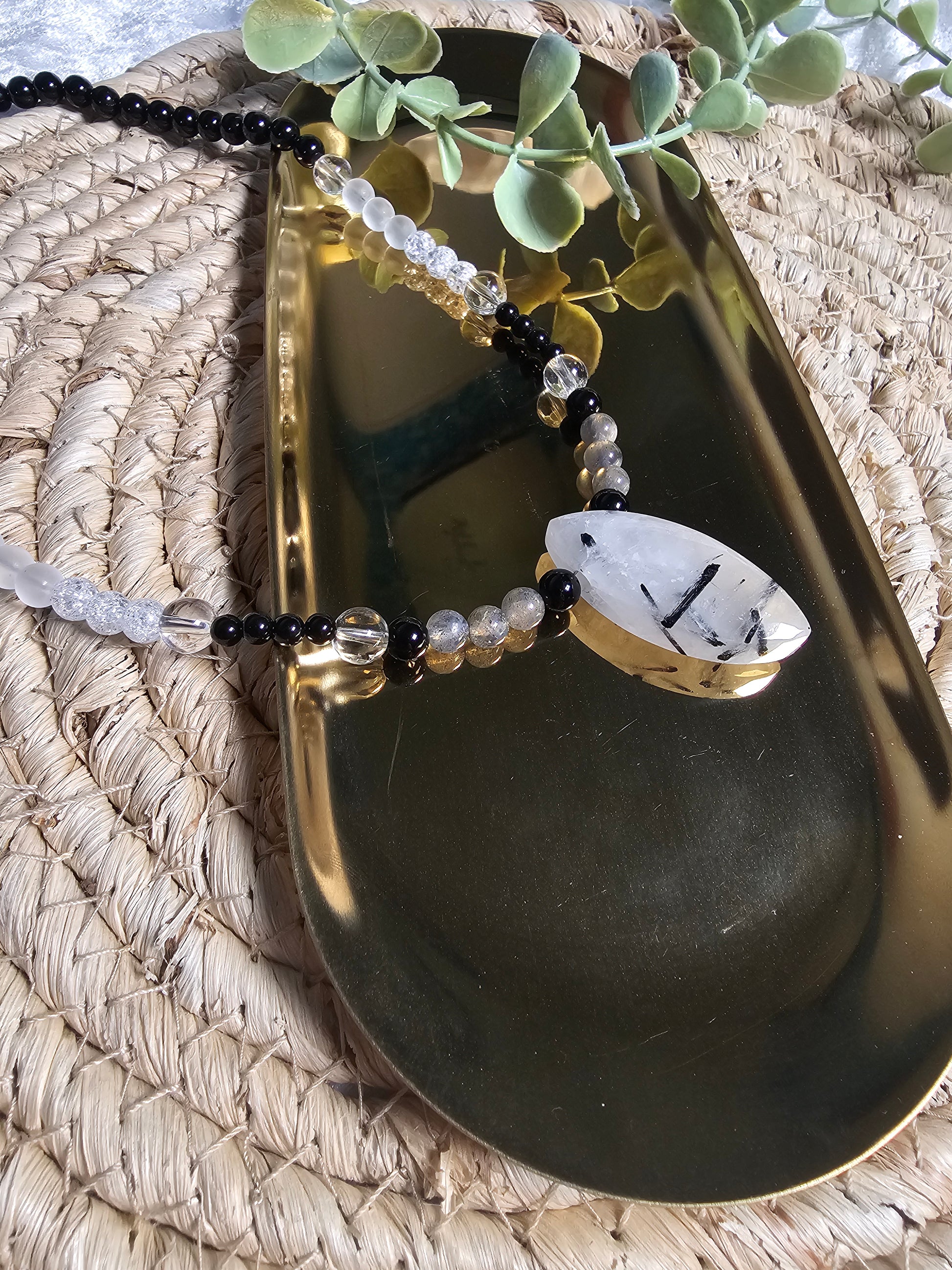 Handgemachte Kette aus Turmalin, Turmalinquarz Navette, Labradorit und Bergkristall. Verschluss ist 925 Silber.
