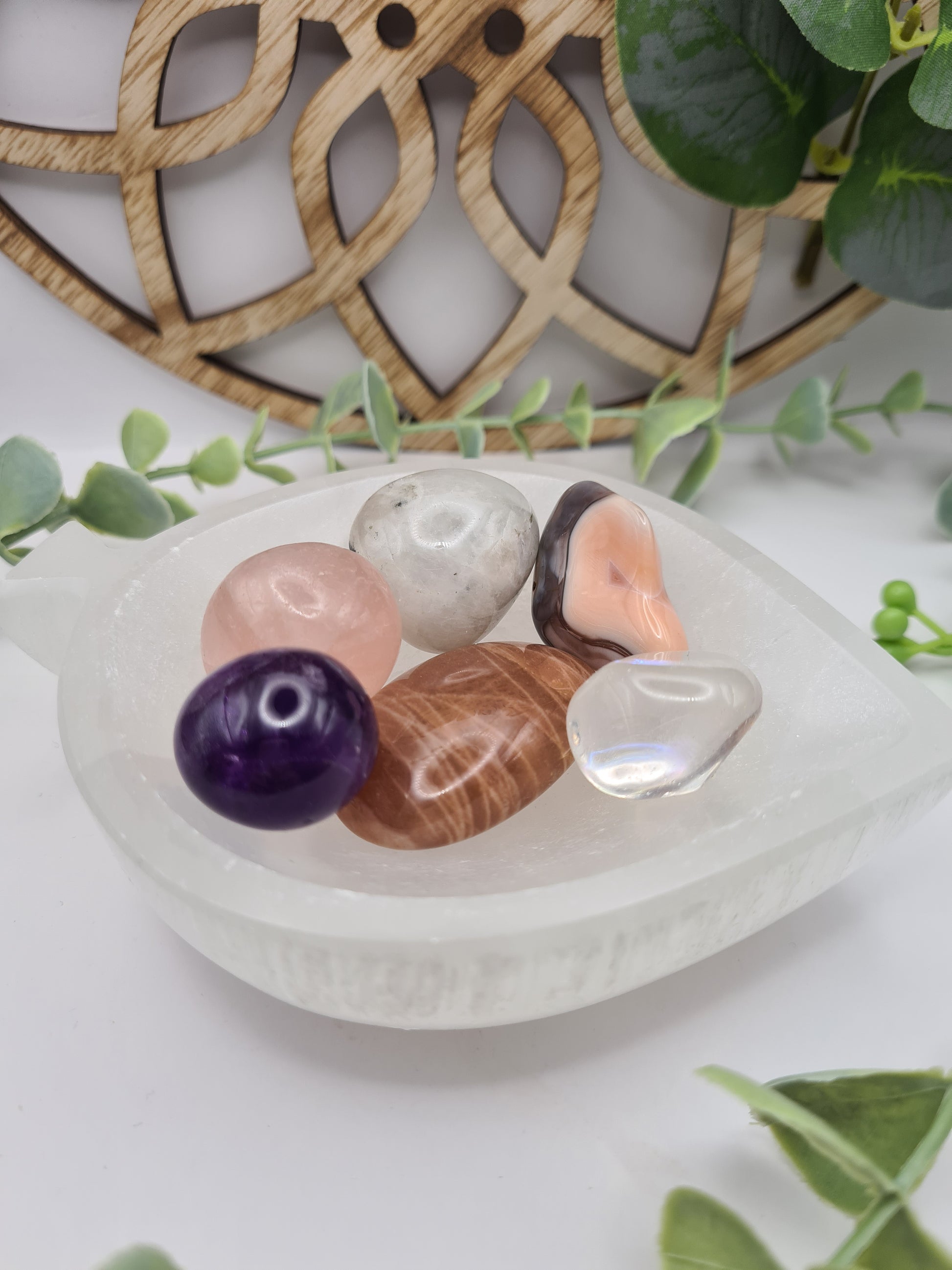 Amethyst, Sonnenstein, Nussgeoden, Wüstenrose, Mondstein, Bergkristall, Rosenquarz, Pyrit, Fluorit, Rutilquarz, Botswanaachat, weißer Labradorit, Angelaura Bergkristall und noch viele andere Sorten.
