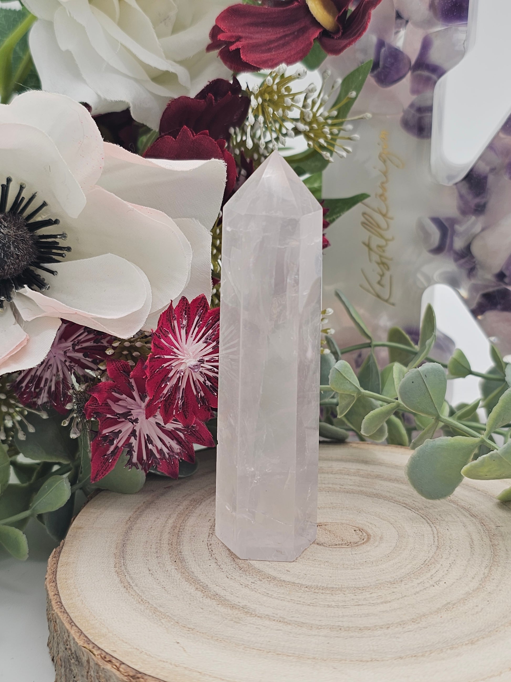 Schöner transparenter Rosenquarz Turm. Kleinee abplatzer an der Seite.